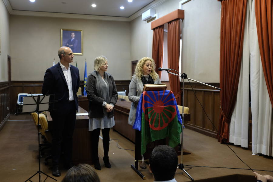 El acto se celebró en el salón de plenos con motivo de la lluvia de la jornada y se ha podido escuchar el himno gitano " Gelem Gelem" de la mano de la familia Suárez.
