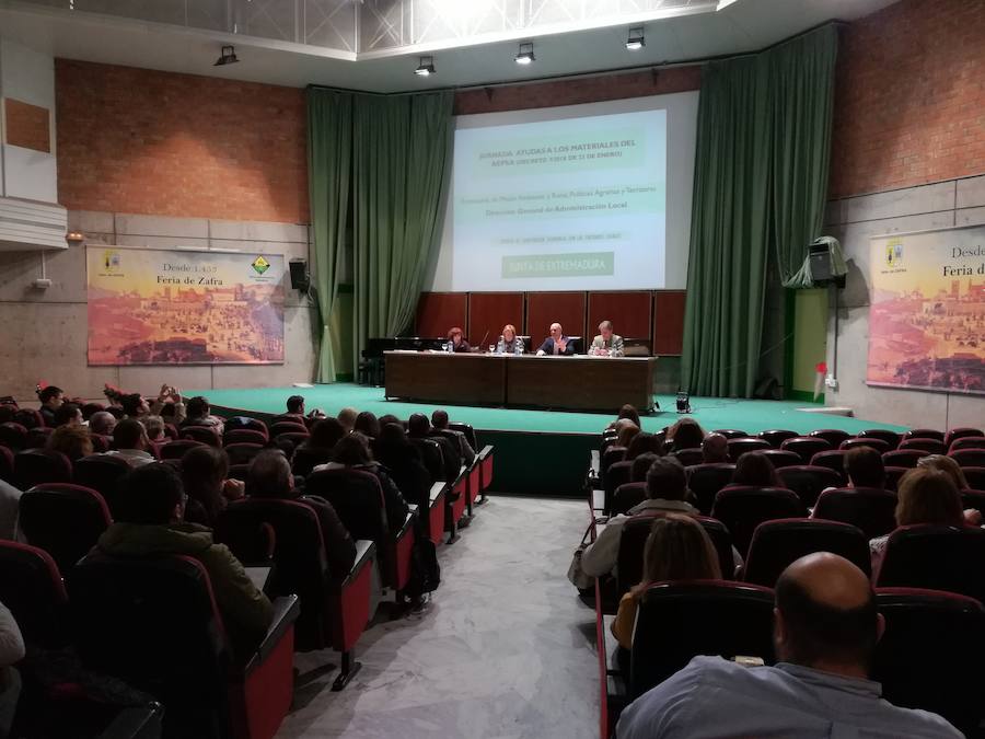Un centenar de técnicos y alcaldes de casi 95 municipios confirmaron su asistencias a las jornadas, celebradas este martes, sobre la puesta en marcha y aplicación del nuevo decreto de ayuda para materiales del AEPSA en Extremadura. Al acto, que ha tenido lugar en el pabellón central del recinto ferial, también han acudido el alcalde de Zafra, José Carlos Contreras, ha asistido, junto a la directora general de la Administración Local de la Junta de Extremadura, Nieves Esteban.