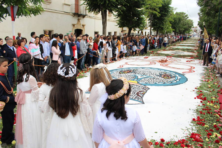 La jornada comenzó con una misa en la parroquia de la Candelaria, a las 10.00 horas, tras ella la comitiva formada por los niños que han recibido en este año su Primera Comunión recorrieron las calles de la ciudad hasta llear al alfombrado, en la calle Ancha. Estuvieron acompañados por el párroco, equipo de gobierno y de la oposición, junta superior de cofradías, hermanos mayores y catequistas. Además de las familias y ciudadanía en general.