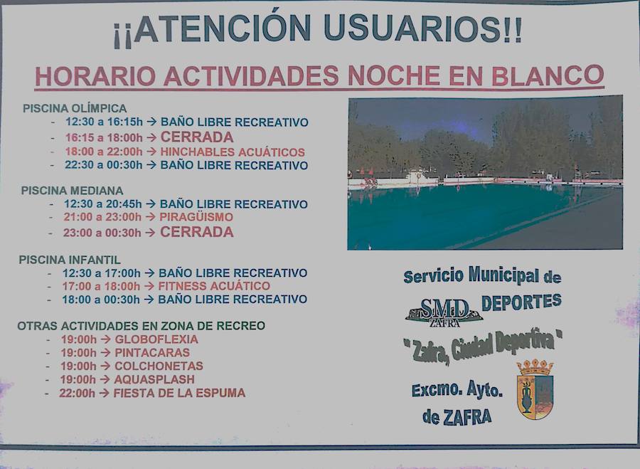 El horario de la piscina será de forma ininterrumpida de 12.30 horas hasta las 00.30 de la noche y durante toda la jornada se realizarán talleres de globoflexia, espuma, actividades acuáticas y terrestres y piraguismo entre otras. En la pasada edición de la Noche en Blanco se consiguió recuadar una cantidad de alimentos que superó los mil kilos.