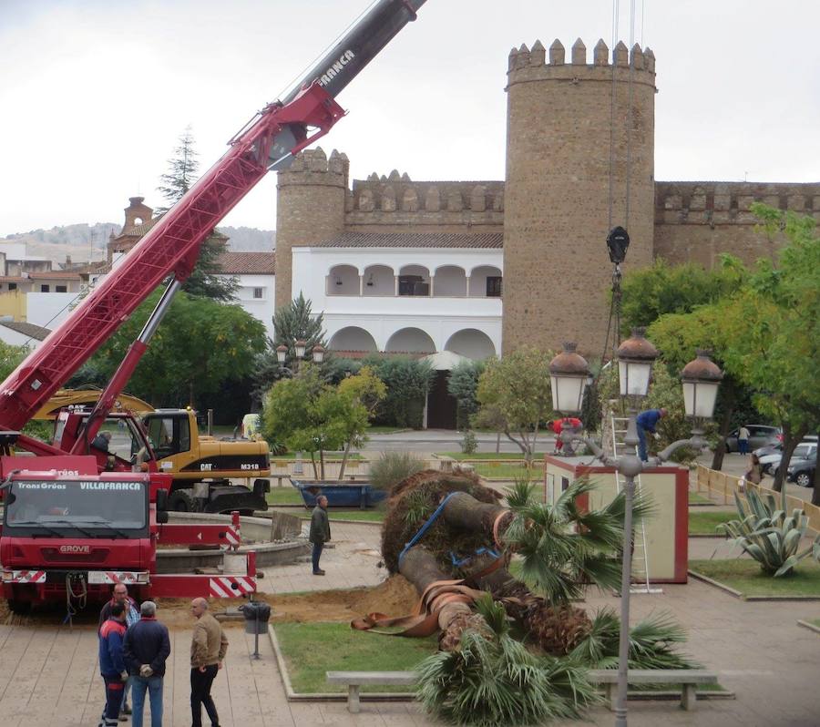 En las tareas de la retirada de las palmeras se contrató una grúa de Villafranca de los Barros y al ver que no se podía sola con ella se ayudó con otras dos grúas. Poco a poco se fueron levantando hasta tumbarlas en el suelo de la plaza. Seguidamente se las trasladó al hueco que se había realizado echándoles la arena y el agua para que agarraran.