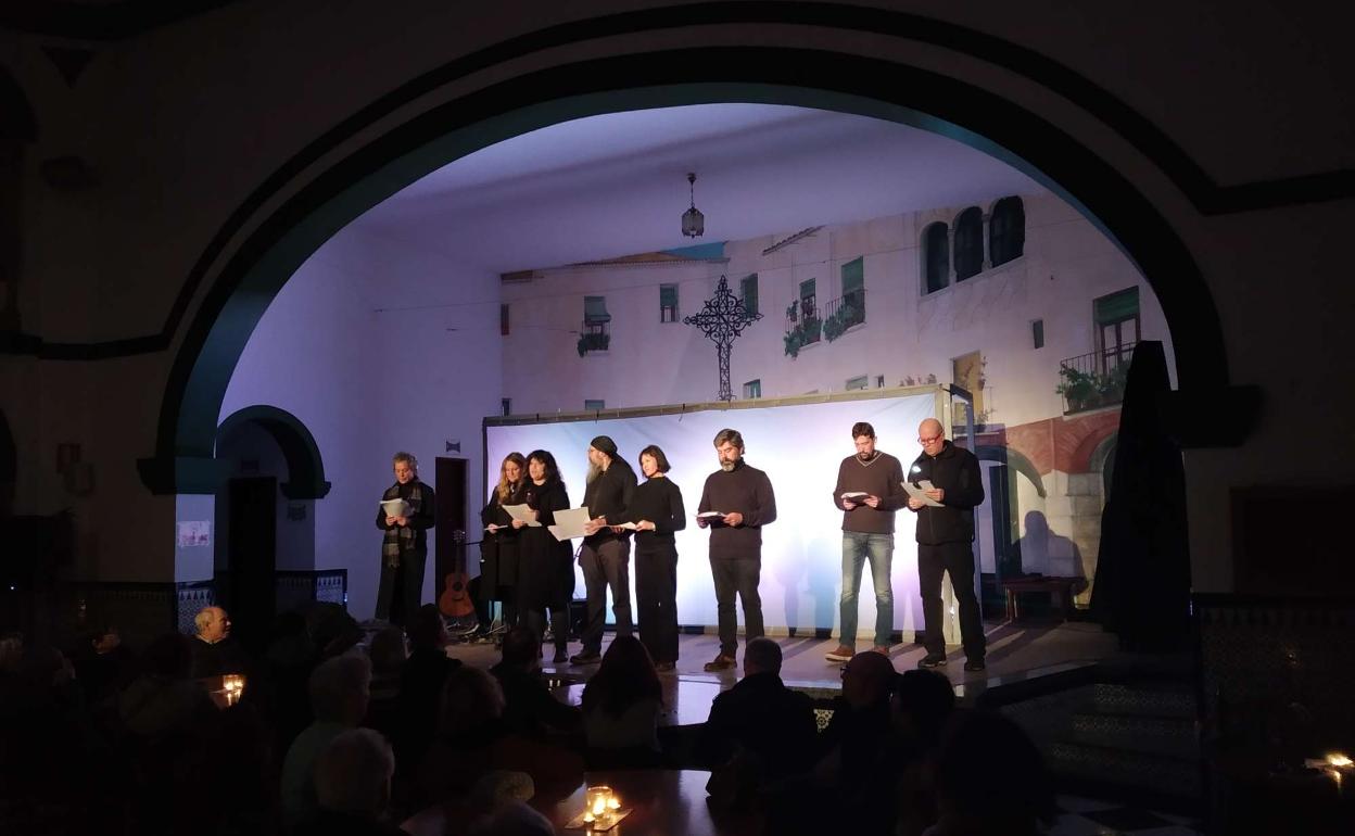 Los integrantes de la Oveja Negra Teatro de Zafra han llevado a cabo un recital poético de algunos de los textos de 'El libro de ... los abrazos', del escritor uruguayo Eduardo Galeano, como parte de la programación del Festival Internacional de Literatura en Español (FILE- Extremadura). Numerosos asistentes han acudido al Centro Recreativo Segedano para disfrutar de la lectura dramatizada de los 37 textos seleccionados y de la música y voz en directo de César Cortés. 'La uva y el vino', 'Los numeritos' o 'La memoria', entre otros, han sido algunos de los textos que se han recitado, entre pequeños fragmentos y textos completos, que han sido dramatizados por Karmele García Salmón, miembro de la compañía de teatro amateur.