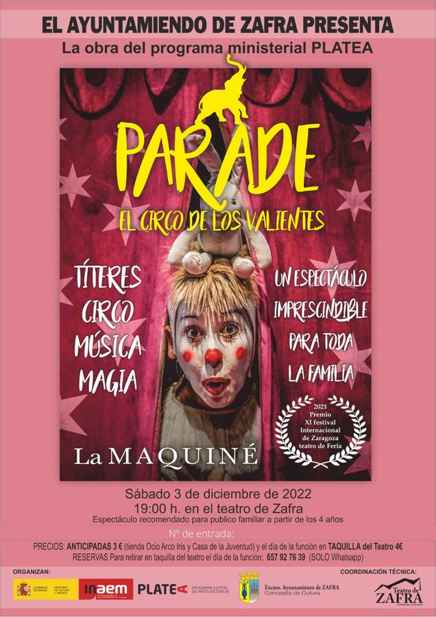 El Teatro de Zafra acogerá el próximo sábado, 3 de diciembre, a las 19 horas, la obra 'Parade, el circo de los valientes, de la ... compañía andaluza La Maquiné Teatro. Un espectáculo para todos los públicos multidisciplinar con actores, música y caniones en directo, títeres, magia, objetos, clown y máscaras.