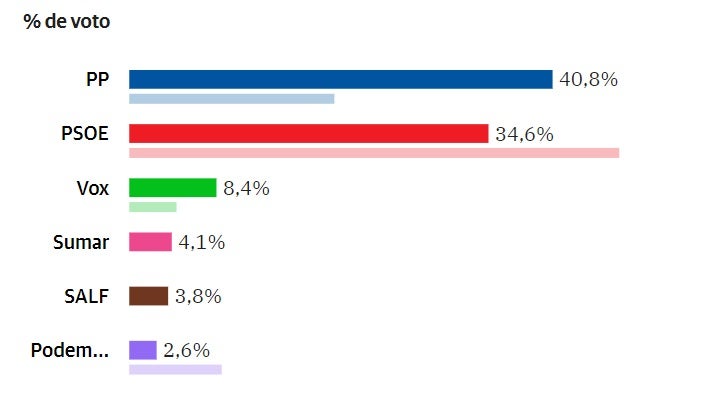 Vox ha obtenido 547 votos (8,41%); Sumar logró 267 votos (4,10%), irrumpe el nuevo partido Se Acabó la Fiesta con 244 votos (3,75%); Podemos 172 (2,64%) y Ciudadanos 56 (0,86%).