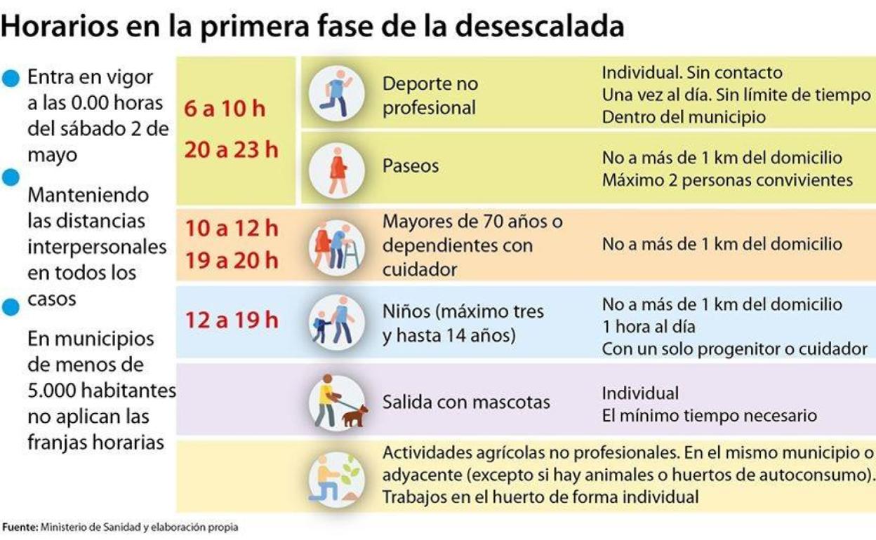 Deportistas y paseantes adultos y adolescentes; personas dependientes y mayores de 70 años; y los menores de 14 años no coincidirán para evitar concentracionesEl camino a la 'nueva normalidad' comenzará este sábado 2 de mayo con muchas limitaciones de movilidad, pero por primera vez desde que el 14 ... de marzo el Gobierno decretara el estado de alarma y ordenara el confinamiento del país, habrá momentos de alivio al aire libre para toda la población, ya sean en forma de paseos, de ejercicio físico o de juegos.