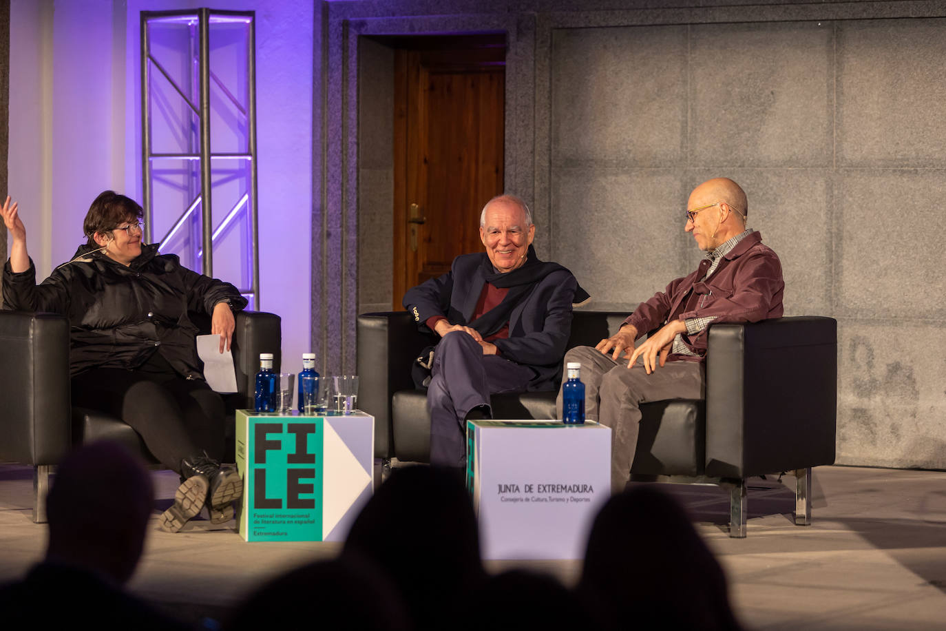 En la primera charla se conversó sobre '¿Cuánto periodismo necesita la novela?', a cargo de Antonio Muñoz Molina, escritor, miembro de la RAE y Premio Príncipe de Asturias de las Letras, y Jesús Ruíz Mantilla, director literario de FILE Extremadura, periodista y escritor, que han debatido hasta qué punto un género requiere de las prácticas del otro y en las que cada uno han compartido sus opiniones y visiones. Molina destacó que los periódicos son «enciclopedias instantáneas, un libro que se está escribiendo siempre, lleno de personajes y de historias». Mantilla, por su parte, señaló que «el periodismo es un género literario puro que se ejerce todos los días y que, antes de escribir, hay que preguntarse el ¿qué? (pregunta ética) y el ¿cómo? (pregunta estética)».