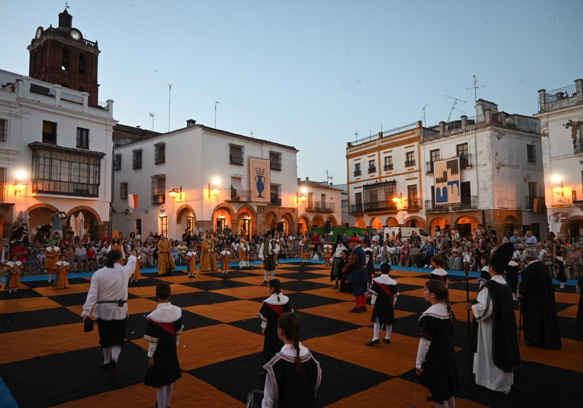 Sobre las 21.30 horas salía desde el Centro Sociocultural García de la Huerta el desfile de la corte ducal y de los trebejos, junto a las 32 piezas. Tras recorrer las calles Huelva, Gobernador, la plaza Corazón de María, Santa Marina y Sevilla, hicieron su entrada hasta el gran tablero de ajedrez de la plaza Grande, que estaba llena de público, para dar comienzo a la partida.