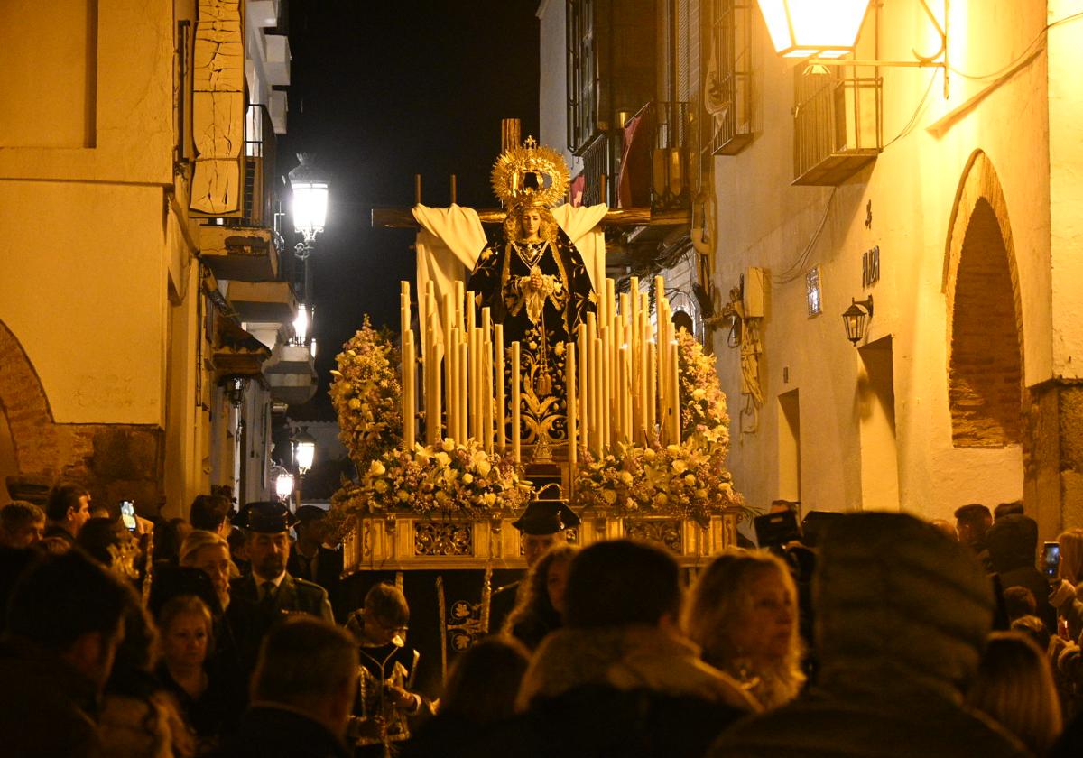 El Grupo Parroquial Nuestra Señora de los Dolores en su Soledad realizó su estación de penitencia por las calles y plazas de Zafra durante la noche del Viernes Santo, desde la Iglesia de Santa María de la Candelaria.