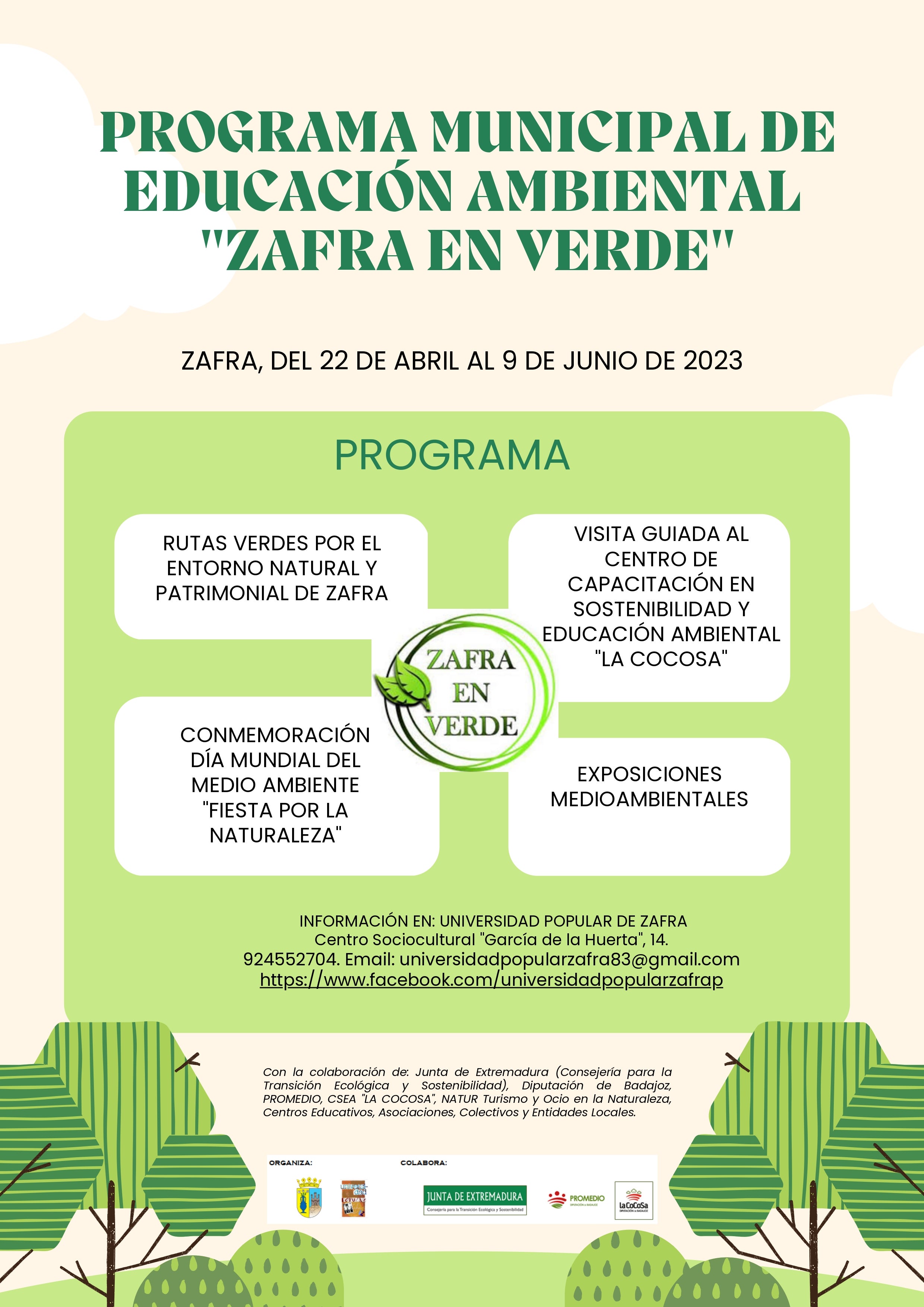 La Universidad Popular de Zafra ha abierto el plazo de inscripción para participar en las actividades del Programa Zafra en Verde, que va a desarrollarse del 22 de abril al 9 de junio. Su directora, Josefa Moreno, ha explicado que estas actuaciones están ya consolidadas dentro del calendario anual y su objetivo principal es concienciar sobre la importancia de cuidar el medio ambiente y educar a la ciudadanía para que esté sensibilizada y, entre todos, protejamos nuestro entorno natural.