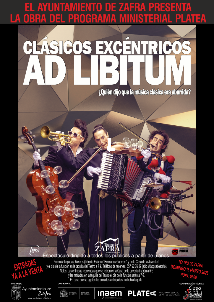 El Teatro de Zafra acoge este domingo 16 de marzo, a las 19 horas, una nueva obra: 'Ad Libitum', de la compañía sevillana Lapso Producciones; una creación basada en música culta y humor blanco y gestual, recomendada para todos los públicos a partir de cinco años de edad.