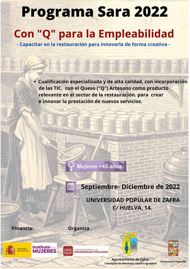 La Universidad Popular de Zafra (UPZ) va a desarrollar durante los meses de septiembre a diciembre el Programa 'Sara 2022: con Q para la empleabilidad: ... Capacitar en la restauración para innovarla de forma creativa', una acción formativa destinada a facilitar la inserción laboral y social de mujeres mayores de 45 años.