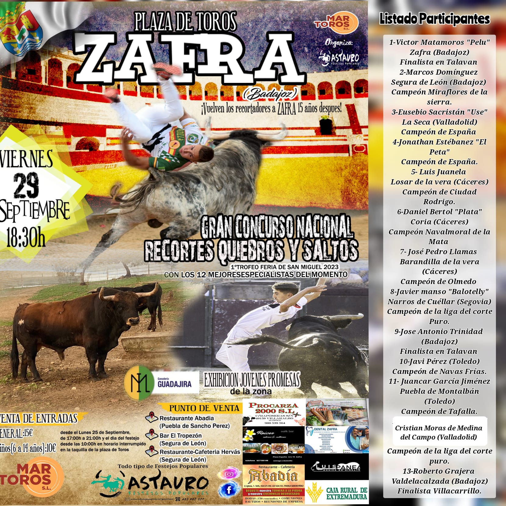 La Plaza de Toris de Zafra acogerá el próximo 29 de septiembre, a partir de las 18.30 horas, un Concurso Nacional de Recortes y Quiebros, I Trofeo Feria de San Miguel con toros de la ganadería Guadajira. En él participarán los 12 mejores especialistas del momento: el zafranse Víctor Matamoros 'Pelu', finalista en Talavan; Jonathan Estébanez el Peta, de Arganda del Rey (Madrid), tricampeón de España: Marcos Domínguez, de Segura de León (Badajoz), campeón Miraflores de la Sierra; Eusebio Sacristán, de La Seca (Valladolid), campeón de España y el número 1 del escalafón durante años; Javier Manso 'Balotelly, procedente de Narros de Cuéllar (Segovia), campeón de la liga del Corte Puro; Joée Antonio Trinidad, de Badajoz, finalista en Talavan; José Pedro Llamas, de Jarandilla de la Vera (Cáceres), campeón de Olmedo; Luis Juanela, de Losar de la vera (Cáceres), campeón de Ciudad Rodrigo; Daniel Bertol 'Plata', que viene de Coria (Cáceres) y es campeón de Navalmoral de la Mata; Cristian Moras, de Medina del Campo (Valladolid), campeón de la Liga del Corte Puro, Javi Pérez de Toledo, campeón de Navas Frías; Juancar García Jiménez, de la Puebla de Montalbán (Toledo), campeón de Tafalla; y Roberto Gragera de Valdelacalzada (Badajoz), finalista en Villacarrillo.
