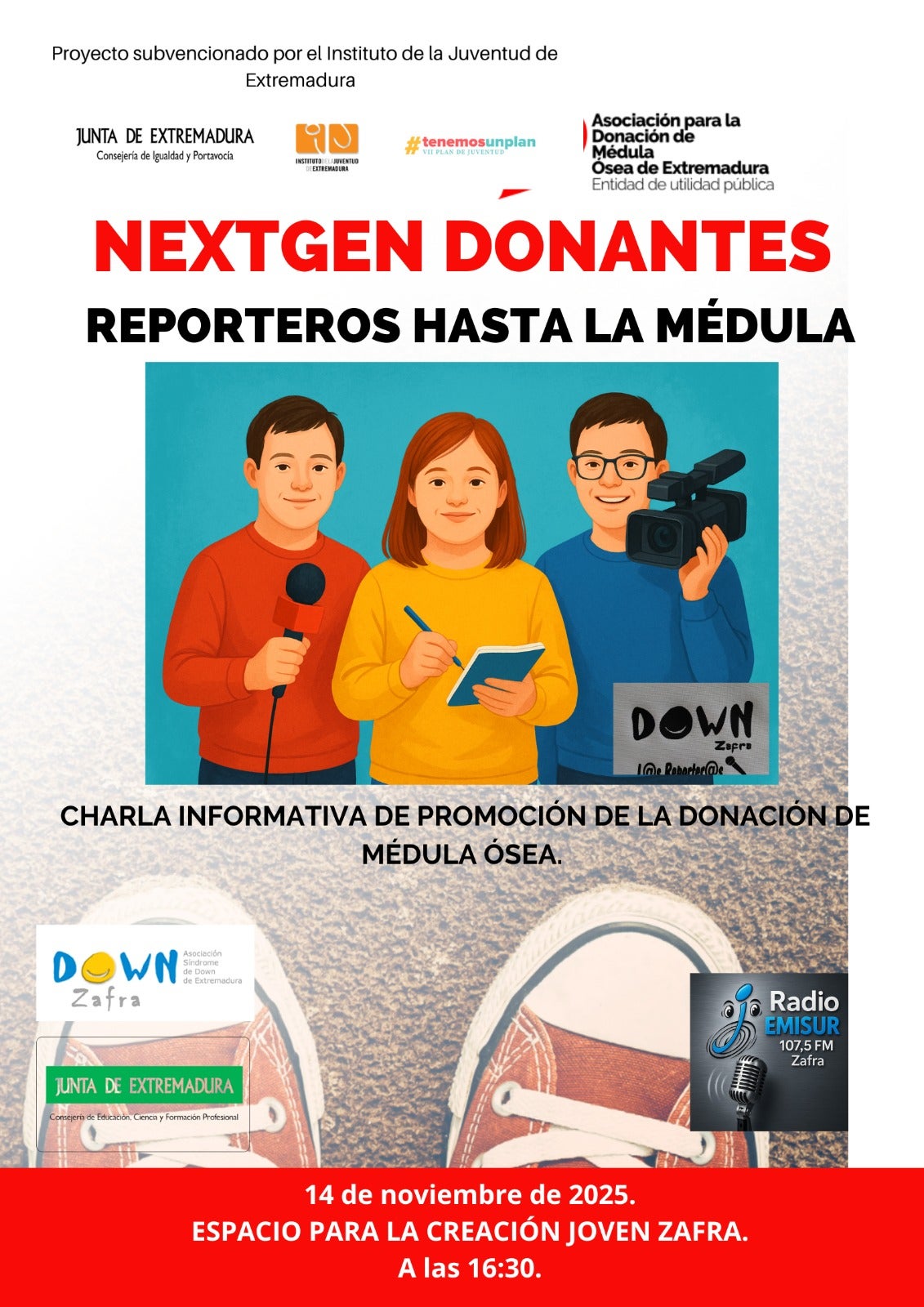 Esta actividad cuenta con la colación del Instituto de la Juventud de Extremadura y la participación de Radio Emisur, Asociación Síndrome de Down de Zafra y grupo Los Reporteros.