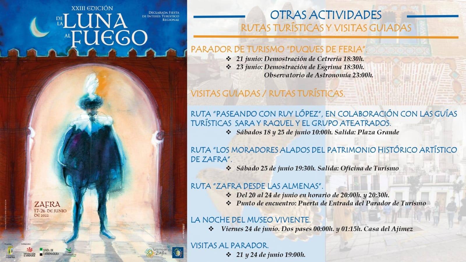 Todas las personas interesadas en participar en las distintas rutas turísticas y visitas guiadas que se van a realizar durante la festividad De la Luna al Fuego, pueden inscribirse a partir de hoy miércoles 15 de junio en la Oficina de Turismo de Zafra, de lunes a viernes de 10.00 a 14.00 horas, y de 17:30 a 19:30 horas por la tarde. Los sábados y domingos el horario será de 10.00 a 14.00 horas.