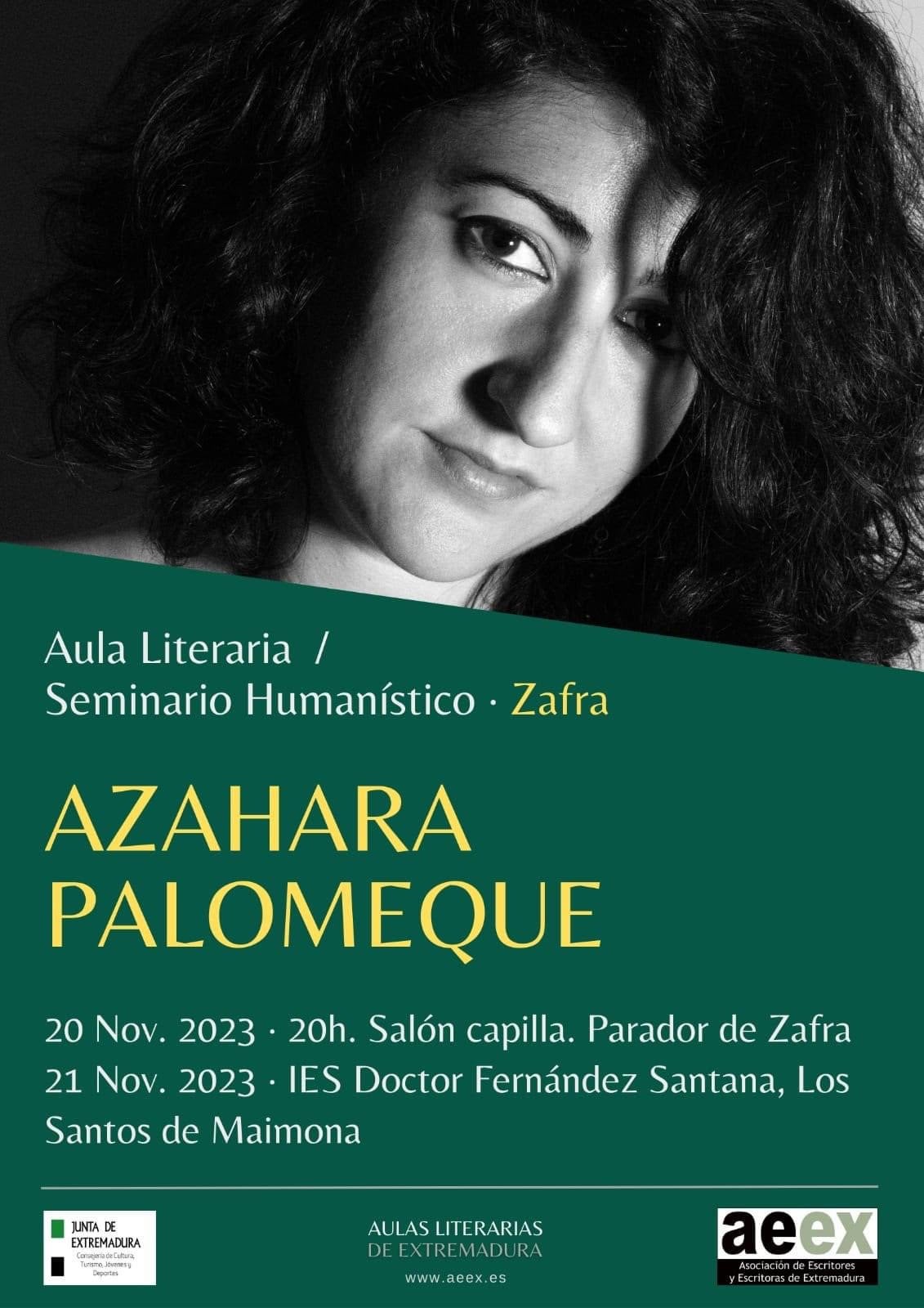 El Seminario Humanístico de Zafra abre hoy lunes, 20 de noviembre, su curso 2023-2024 con un aula literaria a cargo de Azahara Palomeque. Será en el Salón Capilla del Parador de Turismo a las 20 horas.