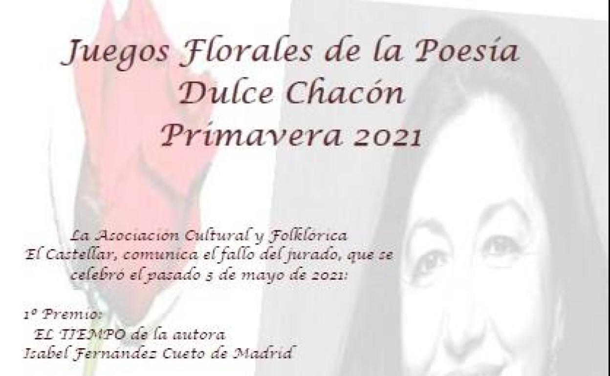 Los Juegos Florales de la Poesía Dulce Chacón Primavera 2021 ya tiene ganadores. La Asociación Cultural y Folklórica el Castellar ha hecho público el fallo ... del jurado, que se celebró el pasado 3 de mayo.