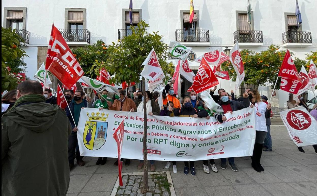 Los trabajadores municipales del Ayuntamiento de Zafra han vuelto a concentrarse, y ya van tres veces, este viernes 4 de febrero, entre las 10.00 ... y las 10.30 horas, a las puertas del consistorio convocados por el Comité de Empresa, representado por CCOO, CSIF y UGT.