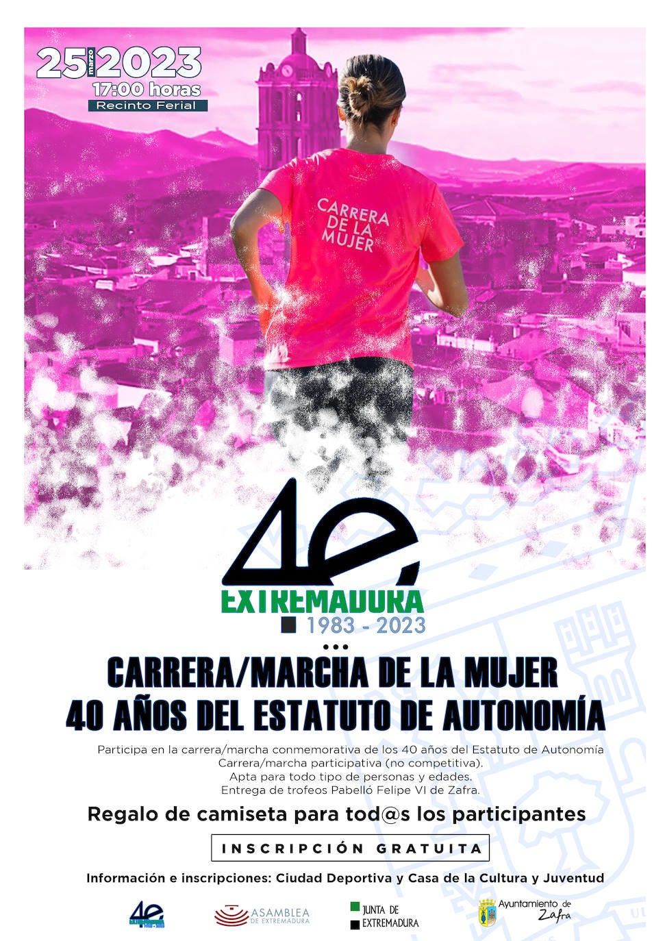 La Junta de Extremadura y la Asamblea regional, en colaboración con el Ayuntamiento de Zafra, han organizado una Carrera/Marcha de la Mujer para conmemorar los 40 años del Estatuto de Autonomía el próximo 25 de marzo.