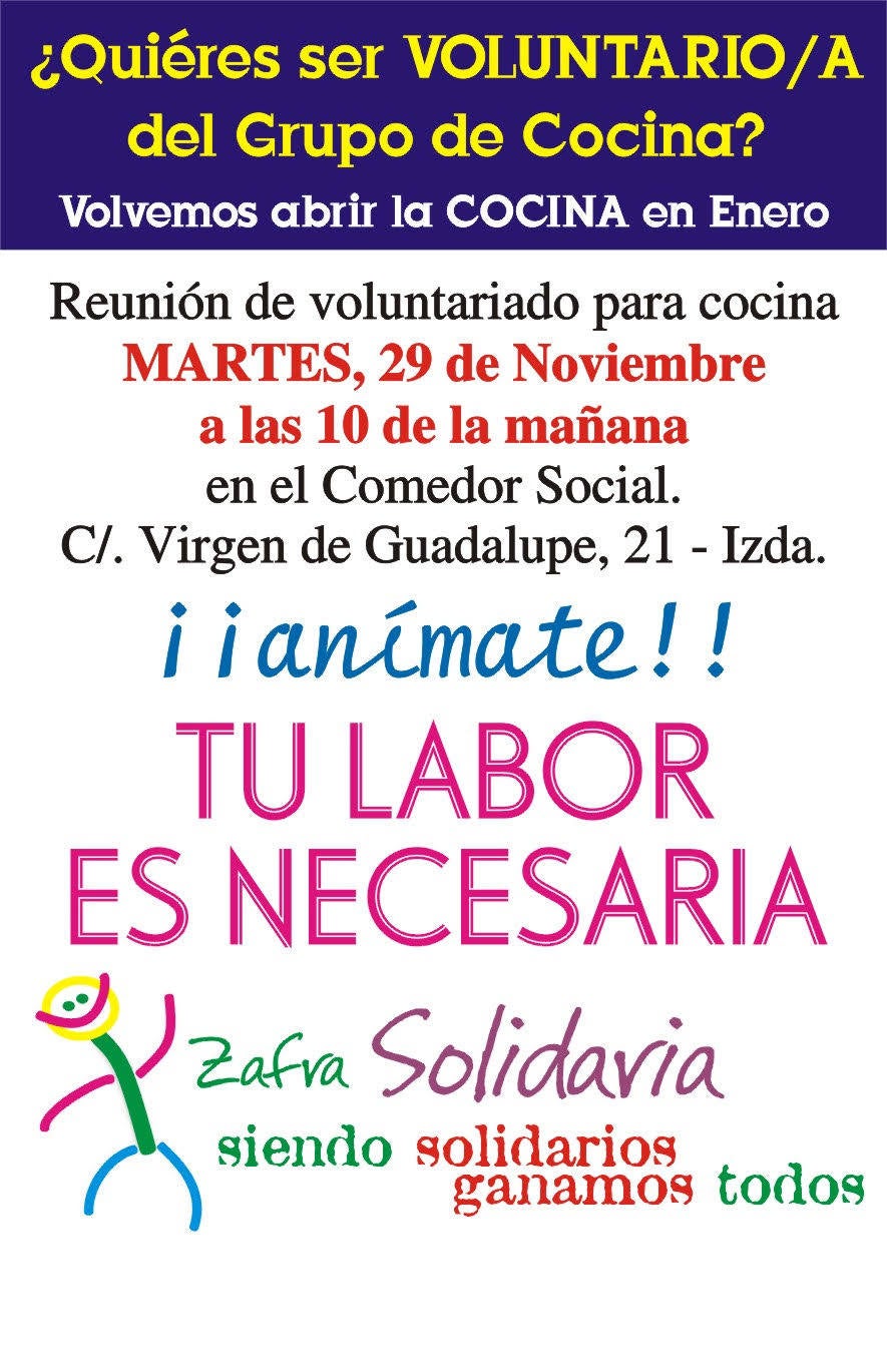 Es por ello que ha convocado una reunión para todas aquellas personas que estén interesados en colaborar en el grupo de cocina para este martes 29 de noviembre, a las 10 de la mañana, en su sede (calle Virgen de Guadalupe 21, izquierda).
