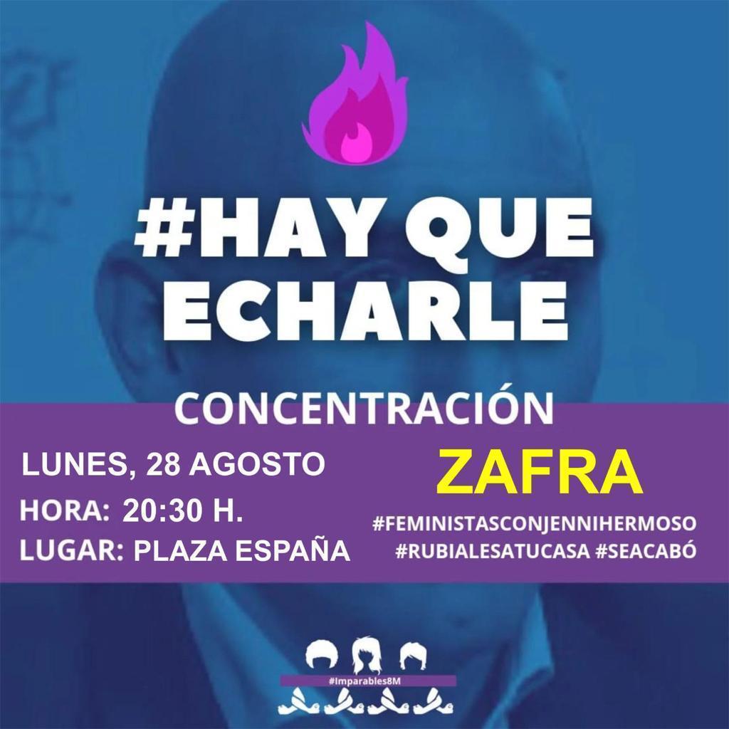Zafra Violeta ha organizado para hoy lunes, 28 de agosto, a las 20.30 horas en la Plaza de España, una concentración para mostrar su apoyo a la jugadora Jennifer Hermoso y a todas sus compañeras del mundo del fútbol, así como para exigir la destitución completa y definitiva de Luis Rubiales como presidente de la Real Federación Española de Fútbol (RFEF).
